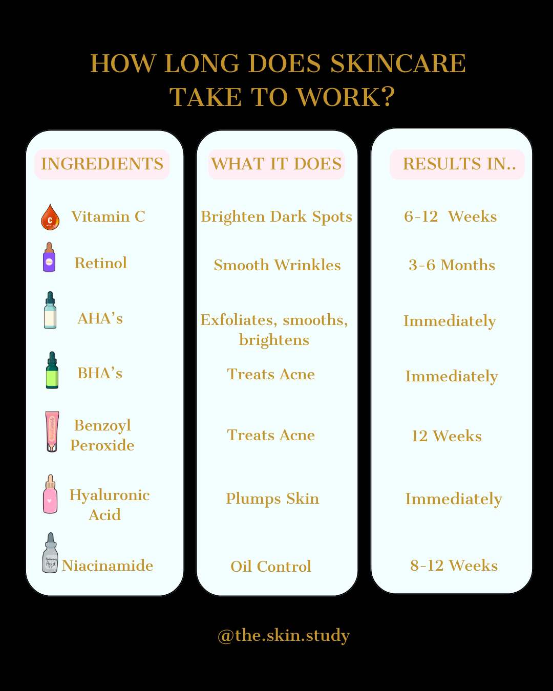 To help guide your journey, here’s a breakdown of some popular skincare ingredients, what they actually do, and how long it usually takes to see real results: