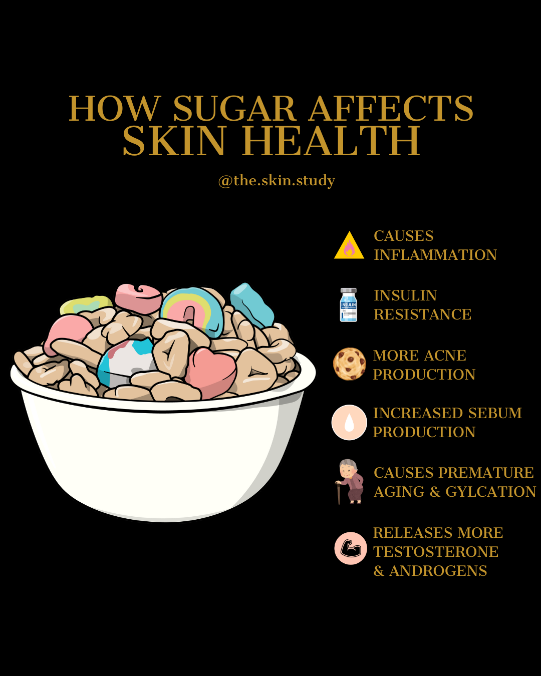 Sugar increases levels of insulin-like growth factor (IGF-1), a hormone known to stimulate the overproduction of sebum (oil) and contribute to the development of acne.